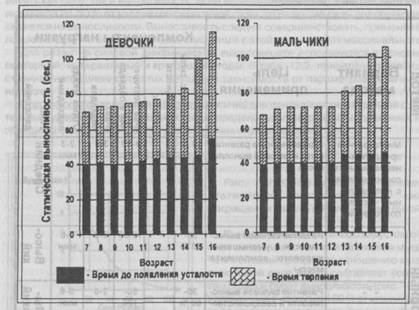 Теория и методика физической культуры сированного утомления, т.е. статическими нагрузками 82-86 % от максимальной ("до отказа"). С их помощью можно воздействовать практически на любые мышечные группы. При этом очень важно, чтобы исходное положение и суставные углы были такими, при которых включаются в работу именно те мышечные группы, выносливость которых нужна для повышения результата в данном упражнении. Рис. 12.6. Возрастная динамика выносливости к статическому усилию у девочек и мальчиков 7-16 лет (по М. Н. Ильиной) В комплексы изометрических упражнений входят обычно не более 6-9 упражнений. Длительность статического напряжения мышц должна продолжаться более 12-20 сек. Естественно, что у каждого человека максимальная длительность статических усилий в том или ином упражнении будет различной. Статические упражнения монотонны, требуют значительных психических напряжений, неинтересны и быстро приводят к утомлению. Стало быть, увлекаться ими при проведении занятий не следует. Выполнение многих изометрических упражнений силового характера связано с большим натужи-еанием всего организма. Поэтому применять их в возрасте 7-14 лет надо осторожно, в малых объемах, избегать длительных предельных статических напряжений и придерживаться следующих методических положений: • статическая выносливость повышается быстрее, когда изометрические напряжения выполняются в сочетании с динамической работой мышц, усиливающей кровообращение (легкий бег «трусцой», различные общеразвивающие упражнения и пр.); • в занятиях не следует применять дополнительных отягощений или они должны быть небольшими (1-3 кг); • статические упражнения надо обязательно чередовать с упражнениями на ра- Лекция 12 Выносливость и методика ее развития стягивание мышц и их произвольное расслабление; • чем больше статическая нагрузка, тем более продолжительным должен быть отдых; • статические упражнения в занятии обычно следует выполнять в конце основной части урока, но при условии, что заключительная часть будет более продолжительной и динамичной. Главную роль в развитии статической выносливости играет повторный метод (в разных вариантах).