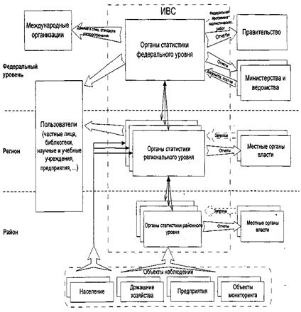 ИВС Госкомстата России представляет собой совокупность методов и средств современной информационной технологии и предназначена для комплексной автоматизации статистических работ, включающих процессы сбора, обработки, хранения, накопления, актуализации, анализа, представления, распространения и использования статистической информации на федеральном, региональном и районном уровнях. Архитектура ИВС включает в себя следующие компоненты: - информационные ресурсы федерального, регионального и районного уровней в виде собственно статистической информации, системы метаинформации и совокупности методологических материалов; - технические ресурсы в составе вычислительных средств, средств телекоммуникаций и связи, информационно-издательских и полиграфических средств; - программно-технологические ресурсы, включающие базовое и прикладное программное обеспечение, проектно-технологическую документацию, стандарты и соглашения. Информационные потоки в статистике постоянно преобразуются за счет совершенствования телекоммуникаций, средств связи, внедрения передовых информационных технологий, которые позволяют уменьшать нагрузку на технический компонент системы. Но более кардинальный эффект в плане сокращения затрат системы дает совершенствование самой государственной статистики, совершенствование методологии статистических наблюдений и в соответствии с этим оптимизация структуры ИВС Госкомстата России. В середине 90-х годов преобладающим технологическим средством в системе Госкомстата России были КЭОИ – комплексы электронной обработки (статистической) информации. При такой технологии сбор и обработка форм первичной регламентной статистической отчетности предприятий осуществлялись на районном и региональном уровнях, передача данных первичных отчетов по уровням системы производилась по почте, нарочным, по телетайпу, телеграфу и по телефонным каналам связи. Достаточно трудоемкая подготовка данных осуществлялась на магнитных носителях в соответствии с макетами подготовки данных для ЕС ЭВМ или ПЭВМ, в основном, на региональном уровне. Там же производились контроль и обработка подготовленной информации с помощью специализированных программных комплексов на ЕС ЭВМ и/или ПЭВМ, в результате которых получали выходные своды и разрезы для передачи на федеральный уровень. При этом, на районном уровне, ввиду почти повсеместного отсутствия ЭВМ (ПЭВМ), собираемая информация, как правило, обрабатывалась вруч- ную, в связи с чем практически невозможно было оперативно получать выходные отчеты, интересующие местные органы управления, и накапливать информацию для аналитической работы. На региональном уровне действовал достаточно мощный по производительности, но очень энергоемкий комплекс средств электронной обработки данных. Комплексы электронной обработки информации спроектированы, как правило, так, что они не оставляют после себя каких-либо систематизированных баз данных, которые могли бы способствовать проведению оперативного анализа и получению необходимых разрезов и сведений, кроме тех, которые заранее предусмотрены программой разработки. Достаточно большое распространение имели локальные каталоги и справочники. Это вызывало известные затруднения при попытках обеспечения сопоставимости статистич