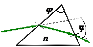 Полный угол отклонения j зависит от показателя преломления n и преломляющего угла d, который, в свою очередь, зависит от угла падения.