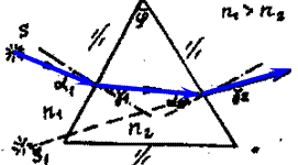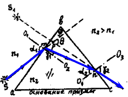 5. Построить нормаль (О3О4) ко второй грани (bc). 6. Поскольку луч переходит из оптически более плотной среды в менее плотную (n2 > n1), то угол преломления на второй грани будет больше угла падения на вторую грань (g2 > a2), и луч снова отклонится к основанию призмы (рис.). Таким образом, изображение S1 источника S кажется смещенным к вершине призмы.