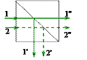 Примером разделительной призмы служит делительный куб (рис.). Он состоит из двух сложенных призм так, что часть света отражается от границы раздела, и в результате падающий луч разделяется на два вышедших.