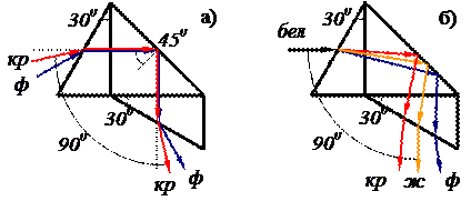 ۰ призма постоянного отклонения, или призма Аббе (рис. а), которая состоит из трех: первая и третья имеют сечение в виде прямоугольного треугольника и преломляющий угол 300, вторая – сечение в виде равнобедренного прямоугольного треугольника; если монохроматический свет направить так, чтобы на заднюю грань второй призмы луч падал под углом 450, то он выйдет под углом 900 к первоначальному направлению, аналогично для другого цвета, в результате каждый цвет по очереди будет поворачиваться на 900 ; призма Аббе (рис. б)используется в монохроматорах.