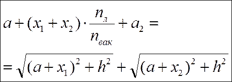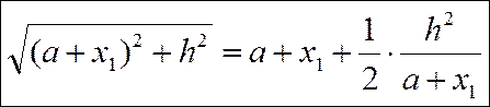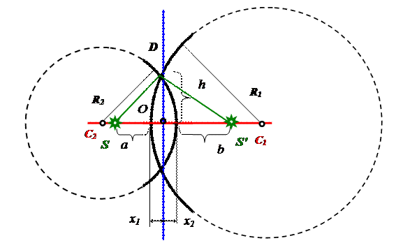 Выразим x1 и x2, находящиеся в левой части равенства (4), из прямоугольных треугольников S'OD и SOD соответственно, учитывая, что h мало по сравнению с радиусами кривизны линзы h << R1, h << R2,