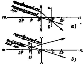 1. Решение (рис. а): - провести главную фокальную плоскость по другую сторону линзы; - провести побочную оптическую ось (проходящую через оптический центр) параллельно падающему лучу; - найти точку K их пересечения; - провести искомый луч после линзы через эту точку. 2. На рассеивающую линзу с фокусом F падает луч под произвольным углом. Построить ход луча после преломления линзой. Решение (самостоятельно, рис. б): - - провести побочную оптическую ось (через оптический центр) параллельно падающему лучу; - найти току K их пересечения; - провести мнимое изображение падающего луча от линзы к точке K; - построить искомый луч как противоположное продолжение мнимого изображения по другую сторону линзы. 3. Собирающая линза с фокусом F освещена точечным источником света S, который расположен на главной оптической оси линзы. Построить изображение S1 источника света. Решение (рис., а): - провести первый луч от источника вдоль главной оптической оси; - провести второй луч в виде падающего на линзу под произвольным углом; - провести побочную оптическую ось параллельно второму лучу; - провести фокальную плоскость по другую сторону линзы; - найти току K пересечения побочной оптической оси и фокальной плоскости; - провести преломленный второй луч через эту точку; - построить изображение источника в виде точки пересечения этого луча и первого; изображение расположено по другую сторону линзы, поэтому – действительное. 4. Собирающая линза с фокусом F освещена точечным источником света S, который расположен на главной оптической оси линзы. Построить изображение S1 источника света. Решение (самостоятельно, рис. б): - провести первый луч от источника вдоль главной оптической оси; - провести второй луч в виде падающего на линзу под произвольным углом; - провести побочную оптическую ось параллельно второму лучу; - провести фокальную плоскость на той же стороне от линзы, что и источник; - найти току K пересечения побочной оптической оси и фокальной плоскости; - провести мнимое изображение преломленного второго луч через эту точку; - продолжить мнимое изображение в противоположную сторону в виде луча; при этом пересечение мнимого изображения, первого луча от источника и главной оптической оси и есть изображение источника – оно расположено на той же стороне, что и источник, поэтому является мнимым. 5. Решение (рис. а): - не требуется проводить вспомогательных лучей и строить фокальную плоскость; - достаточно провести два луча, один из них – побочная оптическая ось, а второй проводится из конца предмета - точки B (или из точки S) параллельно главной оптической оси и после преломления в линзе проходит через фокус F; - пересечение этих - изображение B1 (или S1); - опустить перпендикуляр из точки B1 на главную оптическую ось – их пересечение есть изображение A1. [1] Для самостоятельного изучения