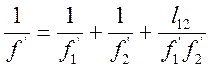 5. Фокусное расстояние центрированной системы двух тонких сферических линз. Определим оптическую силу сложной системы, зная оптические силы составляющих систем и их взаимное расположение. Будем предполагать, что показатели преломления всех пространств предметов и изображений одинаковы. Обозначим через l 12 расстояние H ’1 H 2 передней главной плоскости H 2 второй системы от задней главной плоскости Н’1 первой системы. Оптический интервал между рассматриваемыми системами будет Δ = F’ 1 F 2= F’ 1 H ’1 + H ’1 Н 2 + H 2 F 2 = f’ 1 +l 12– f 2 = f’ 1 +l 12– f’ 2. Подставляя это значение в формулу (12.3), получим