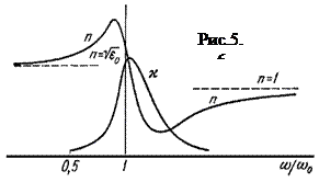 Показатель преломления n представлен штриховой, а показатель затухания κ — штрихпунктирной линией. Величина n обращается в нуль на участке, где ε(ω)<0. Показатель затухания κ, наоборот, на этом участке отличен от нуля, обращаясь в нуль при всех остальных частотах. Величина κ описывает именно затухание, а не поглощение волн, так как кривые Рис. 5.5 относятся к модели непоглощающей среды (диэлектрическая проницаемость ε всюду вещественна). Впрочем, эти выводы имеют формальный характер, так как вблизи собственной частоты ω0 соотношение В частности, поднимающаяся ветвь кривой ε=ε(ω) левее точки ω=ω0 должна переходить в опускающуюся, чтобы сомкнуться с другой поднимающейся ветвью, расположенной правее той же точки. Это замечание позволяет без особого труда представить ход кривых n и κ в окрестности полосы поглощения. Типичный вид кривых n = n (ω) и κ = κ (ω) приведен на Рис.5.6. Там, где поглощение невелико, показатель преломления n (ω) возрастает с частотой. В этом случае говорят, что дисперсия нормальная. В области сильного поглощения n (ω) уменьшается с частотой. Такую дисперсию называют аномальной. Ее трудно наблюдать из-за сильного поглощения. Теоретические соображения, изложенные выше, справедливы не только для электронов, но и для ионов, и притом в последнем случае классические представления более обоснованы ввиду относительно больших масс ионов. Во всех телах наблюдается не одна, а несколько полос поглощения. Чтобы это \честь, в классической модельной теории принимается, что вещество построено из частиц различного типа — электронов и ионов, которые ведут себя как затухающие гармонические осцилляторы с различными собственными частотами. В газах можно пренебречь их взаимодействием. Тогда формула (5.11) принимает вид
