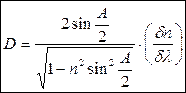 Дисперсия спектральных приборов. Спектральные приборы, как известно, служат для обнаружения излучения и анализа распределения его по длинам волн. Отдельным длинам волн соответствует определенный максимум. Контур максимума зависит от характеристик данного спектрального прибора. В зависимости от контура соседние близлежащие максимумы, перекрываясь друг с другом, могут образовать один результирующий максимум. Очевидно, что для данной формы криво интенсивности расстояние между максимумами соседних длин, волн следует принять за параметр, характеризующий спектральный прибор. В зависимости от величины этого параметра, который называют дисперсией прибора, соседние линии можно наблюдать либо как самостоятельные, либо как одну линию. Поскольку положение спектральных линий в приборе определяется направлением лучей, а на экране (или на фотопластинке) — расстоянием между соответствующими спектральными линиями, вводятся соответственно такие характеристики прибора, как угловая (D) и линейная (D*) дисперсии. Угловая дисперсия и определяется отношением углового расстояния линии, отличающихся по длине на δλ, к величине этого интервала: D= δφ/ δλ. (5.20) Если расстояние между линиями, отличающимися по длине на δλ обозначить через δ S, то согласно определению линейной дисперсии имеем: D*= δ S /δλ. (5.21) При известном фокусном расстоянии (f) линзы, проектирующей спектр на экран, исходя из соотношения δ S=f δ φ, можно найти связь между D и D*: D*=fD. (5.22) В качестве примера найдем дисперсию дифракционной решетки, призмы и интерферометра Фабри-Перо. Дисперсия призмы. Вспектрографах призма располагается так, чтобы угол отклонения луча был минимальным. Поэтому, волны различной длины отклоняются под разными углами φмин (из-за зависимости n от λ). Принимая во внимание зависимость φ от n, а также зависимость n от λ и подставляя φ=φмин имеем