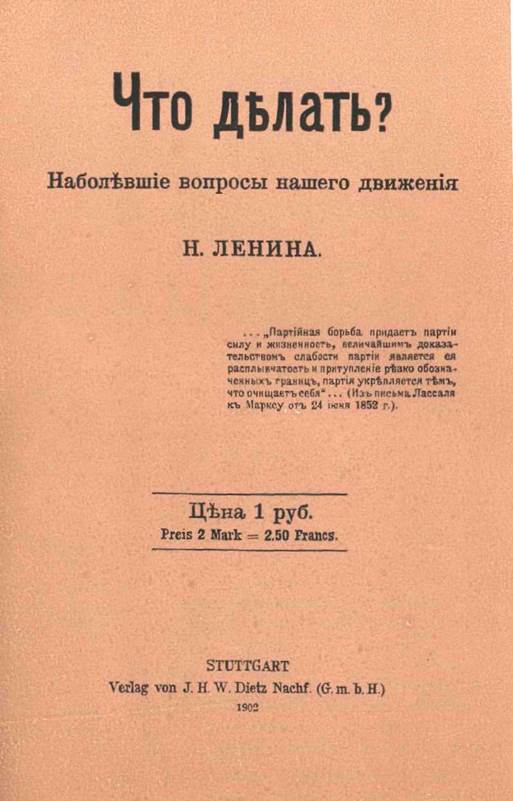 ЧТО ДЕЛАТЬ? НАБОЛЕВШИЕ ВОПРОСЫ НАШЕГО ДВИЖЕНИЯ1 «... Партийная борьба придает партии силу и жизненность, величайшим доказательством слабости партии является ее расплывчатость и притупление резко обозначенных границ, партия укрепляется тем, что очищает себя...» (Из письма Лассаля к Марксу от 24 июня 1852 г.) Написано осенью 1901 — в феврале 1902 г. Напечатано в марте 1902 г. в Штутгарте отдельной книгой Печатается по тексту книги, сверенному с текстом сборника: Вл. Ильин. «За 12 лет», 1907