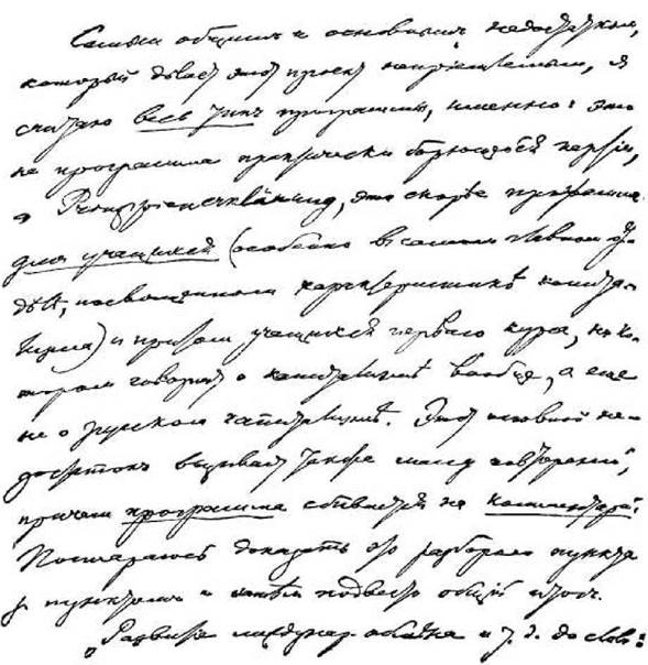 Первая страница рукописи В. И. Ленина с замечаниями на второй проект программы Плеханова. — 1902 г. Уменьшено _____________ ЗАМЕЧАНИЯ НА ВТОРОЙ ПРОЕКТ ПРОГРАММЫ ПЛЕХАНОВА____________ 215 характер движения, которое по форме своей — говоря словами «Коммунистического манифеста» — необходимо является сначала национальным. § П. «Подобно социал-демократам всех других стран, русские социал-демократы стоят на международной почве. Они смотрят на свою партию, как на один из отрядов всемирной армии пролетариата, как на часть международной социал-демократии». Подчеркнутые мною слова излишни, ибо они не прибавляют ровно ничего к тому, что сказано перед этим и после этого. Эти излишние слова только ослабляют совершенно достаточное и рельефное выражение мысли в словах «отряд» и «часть». § III. «Они преследуют ту же конечную цель, как и социал-демократы всех других стран». Тоже излишние слова, повторенные два раза ниже в §§ XIII («конечная цель всех усилий международной социал-демократии» и т. д.) и XVII («единство общей конечной цели»). «Отряд» армии потому и есть отряд, что преследует ту же цель. § IV. «Эта общая социал-демократам всех стран» (опять излишнее повторение) «конечная цель определяется характером и ходом развития буржуазного общества». Тоже излишние слова, ибо дальше именно и показано, как характер и ход развития буржуазного общества «определяют» эту конечную цель. Этот параграф — что-то вроде заголовка, названия отдела. Но заголовки, необходимые в учебнике или в статье, совершенно не нужны в программе. Alles, was im Programm überflüssig, schwächt es (Энгельс в замечаниях на проект Эрфуртской программы)98. §§ V и VI (а также начало VII) вызывают, помимо формальных замечаний, одно общее и основное возражение, направляющееся против всего типа программы, намечаемого проектом. Я изложу сначала это общее возражение (для чего необходимо будет отчасти защищать контрпроект), а потом перейду к формальным замечаниям.