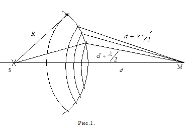 То есть волны от соседних зон приходят в точку М в противоположных фазах. Амплитуда колебаний, приходящих в точку М от зон, зависит от площади зоны и уменьшается с увеличением расстояния (dk) от зоны до точки М и с увеличением угла ak, между нормалью к поверхности зоны и направлением на точку М. В точке М происходит интерференция волн, приходящих от зон Френеля. Для сферического фронта волны, возбуждаемой точечным источником (рис.1) площадь и радиус k-ой зоны Френеля записывается (доказать):