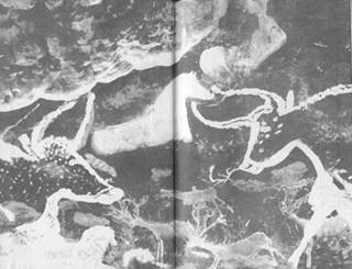 Среди демонов, духов, незримых сил и богов, окружавших древнего человека, почти повсеместно чувствуется постоянное присутствие Предков - или в виде призраков, или резных идолов (верхнее фото). Следуя советам предков, придерживаясь их обычаев, послушно идя по их стопам, племя могло быть уверено, что останется в безопасности. Строгое подчинение традиции являлось абсолютной необходимостью, так как даже малейшее отступление могло порвать цепь культурной преемственности. Однако общественные установления «примитивных» народов зачастую оказывались не менее угнетающими и оглупляющими, чем сегодняшние технические церемониалы и научный эксгибиционизм. Маска, возможно, появилась как приспособление, позволявшее быстро изменить внешность или поменяться ролями. Могущественное абстрактное изображение сверхъестественного существа предвосхищает некоторые из фантазий К.С. Льюиса или Олафа Стэплдона: замечательное изображение - правдоподобное вплоть до рудиментарных ножек - Большого Мозга! Подобные формы, часто называемые «примитивными», в действительности знаменуют заключительные стадии чрезвычайно сложной по своему устройству племенной культуры. На снимке группа соплеменников под зонтикообразной маской, изображающей священное существо, которую вместе надевают посвящаемые в таинства новички. Ангорам, Новая Гвинея.