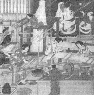 Несмотря на престиж мегатехники, малые искусства и ремесла тоже распространялись вширь и вглубь, и владевшие ими мастера накапливали навыки, совершенствовали традиционные методы, использовали местные ресурсы, приспособлялись к местным условиям, устанавливали стандарты ремесленного качества и изобретали бесконечное множество новых образцов товара. Большинством ремесел занимались дома или в усадьбе, распределяя обязанности в зависимости от возраста, умения и силы, и причем все участники несли личную ответственность за свою часть работы. Эти японские изображения типично «средневековых» ремесел, приписываемые художнику Ёсинобу Кано (ок. 1620-1630 гг.), были созданы приблизительно в ту же самую пору, что и сходные по сюжету европейские гравюры на дереве Йоста Аммана и других. Вся эта серия отмечена редкостным социологическим чутьем: здесь показаны не только работники, материалы и трудовые процессы, но и домашнее окружение. Только отсутствие лишнего пространства мешает мне показать разнообразие индивидуальных жилищ - от скромной хижины плетельщика циновок с ветхой соломенной крышей до изысканных и удобных помещений для занятия привилегированными ремеслами - золотой лакировкой, вышивкой, изготовлением доспехов, мечей, - которые служили главным образом нуждам военной аристократии. Ткачество и прядение. Обратите внимание на разный возраст работниц - от пожилой прядильщицы до девочки, сматывающей нить. Фрагменты живописи из Китаина, буддистского храма в Кавагойе.