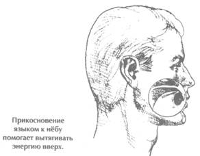 Тогда как западные ученые до сих пор не могут понять, почему эта энергия, или ци, циркулирует в нашем теле, традиционной китайской медицине уже очень давно известны пути, по которым она движется в нашем теле, и способы ее использования для укрепления здоровья. Вам нужно знать только самый основной из этих путей, который называется Микрокосмической Орбитой. Этот путь, или канал, проходит в теле человека от половых органов вдоль позвоночника к голове, затем опускается через язык на переднюю часть тела, в пупок и вновь в половые органы. Энергетические каналы располагаются в нашем теле отнюдь не случайным образом. Они закладываются еще на эмбриональной стадии нашего развития. Вскоре после зачатия тело зародыша похоже на плоский диск. По мере развития зародыша этот диск складывается, при этом остаются два «шва» — сзади и спереди. Задний шов —это линия позвоночника; передний шов проследить труднее. Мы можем увидеть его, если края зародышевого диска не до конца сомкнулись — например, у ребенка, родившегося с заячьей губой. Очень часто у беременных женщин видна проходящая по центру живота темная линия, которая называется tinea nigra. Микрокосмическая Орбита — это два канала, один из которых направлен вверх по спине, а другой — вниз по передней части тела. Эти два канала соединяет ваш язык, поэтому очень важно, чтобы вы научились касаться кончиком языка передней части нёба (см. рис.). На передней части нёба есть небольшая впадина, и именно через нее энергия стекает из головного мозга на язык, а затем, через горло и грудь, в живот. (Если у вас высокое кровяное давление, старайтесь держать язык у нижней челюсти и не касаться нёба, а также опускать энергию вниз до конца, то есть до подошв стоп.) ДВИЖЕНИЕ ЭНЕРГИИ