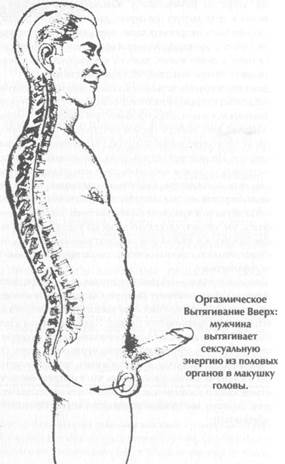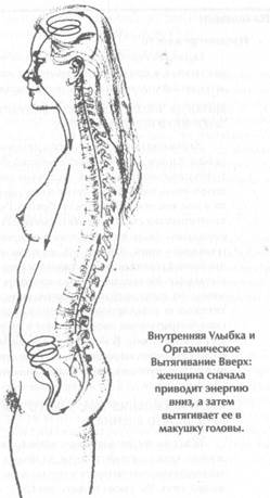 После того как вы опустите энергию вниз с помощью Внутренней Улыбки, вам нужно будет поднять ее вверх с помощью Оргазмического Вытягивания Вверх. Подъем энергии из половых органов вверх по позвоночнику вызывает очень приятные ощущения и стимулирует все нервы, расположенные рядом с ним. Научившись направлять свою энергию по Микрокосмической Орбите, вы сможете испытывать это оргазмическое наслаждение в любое время, даже не возбуждаясь сексуально. Это намного лучше, чем двойной кофе с молоком! Для того чтобы научиться опускать и поднимать энергию, требуется немало времени, поэтому соберитесь с духом и силами. Некоторые, однако, обнаруживают, что в состоянии управлять энергией безо всякого труда и подготовки. Очень многое зависит от типа вашей нервной системы и способности концентрироваться. Не расстраивайтесь, если вам ничего не удалось почувствовать в первые несколько дней или недель занятий. Если вы только начинаете заниматься медитацией, йогой или боевыми искусствами, вам потребуется гораздо больше времени, чтобы научиться чувствовать свою энергию. Когда вы этому научитесь, вас удивит, насколько легко ею управлять. Так как энергия движется в вашем теле по естественным каналам, она сама будет управлять вашим мозгом, если он попытается как-то не так управлять ею. Половые органы — мощный источник энергии. Вы должны научиться чувствовать эту энергию и направлять ее по каналам своего тела. В древнем даосском высказывании энергия человеческого тела сравнивается с водой. Половые органы и позвоночник — это насосы, которые перемещают эту энергию и вливают ее в голову, обеспечивая питание головного мозга. Оттуда она, подобно водопаду, стекает в живот, где скапливается, словно в водохранилище. Даосы знали, что в природе нет ничего сильнее воды, а в нашем теле нет ничего сильнее сексуальной энергии, поэтому вы должны научиться умело и безопасно с ней обращаться.