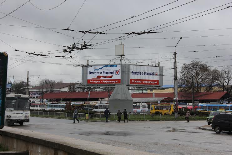 Несмотря на то, что еще суббота властями Крыма была объявлена "днем тишины", по всему городу остались на прежних местах агитационные плакаты, призывающие крымчан идти на референдум и проголосовать за присоединение к России.