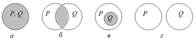 рис. 5. Пересечение: а – тождественные понятия; б – перекрещивающиеся понятия; в – подчиненное и подчиняющее понятия; г – несовместимые (соподчиненные) понятия Объединение. Операция объединения запишется так:
