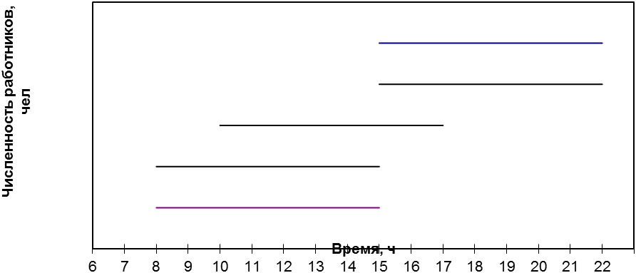 N = Общая численность производственных работников с учетом выходных и праздничных дней, отпусков и дней по болезни: N2= N1K1 = 3,8 ∙ 1,13 = 4,3 = 4 (11), где К1- коэффициент, учитывающий выходные и праздничные дни; значения коэффициента зависят от режима работы предприятия и режима рабочего времени работника. Например: режим работы предприятия 6 дней в неделю, с одним выходным днем, тогда К1= 1,13 Режим работы холодного цеха устанавливаем с 7 00 – 23 00, работники цеха работают по двухбригадному графику. Общее руководство цехом возложено на бригадира из числа поваров 5 или 6 разряда. В холодном цехе работают 2 повара с 8 00 до 15 00, 1 повар с 10 00 до 17 00, 2 повара с 15 00 до 22 00. Работники первой смены приступают к выполнения задания, работники второй смены выполняют производственную программу и занимаются подготовкой полуфабрикатов на следующий день. По окончании смены повара отчитываются за проделанную работу. График выхода на работу представлен на рисунке: