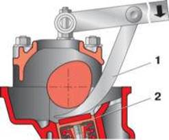 1 – приспособление 2 – толкатель Фиксирование толкателей клапанов при замене регулировочной шайбы