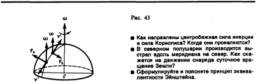 Вектор Fк перпендикулярен векторам скорости v' тела и угловой скорости вращения Сила Кориолиса действует только на тела, движущиеся относительно вращающейся системы отсчета, например относительно Земли. Поэтому действием этих сил объясняется ряд наблюдаемых на Земле явлений. Так, если тело движется в северном полушарии на север (рис. 43), то действующая на него сила Кориолиса,как это следует из выражения (27.4), будет направлена вправо по отношению к направлению движения, т. е. тело несколько отклонится на восток. Если тело движется на юг, то сила Кориолиса также действует вправо, если смотреть по направлению движения, т. е. тело отклонится на запад. Поэтому в северном полушарии наблюдается более сильное подмывание правых берегов рек; правые рельсы железнодорожных путей по движению изнашиваются быстрее, чем левые, и т. д. Аналогично можно показать, что в южном полушарии сила Кориолиса, действующая на движущиеся тела, будет направлена влево по отношению к направлению движения.