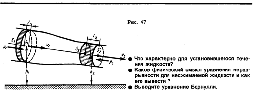 § 30. Уравнение Бернулли и следствия из него Выделим в стационарно текущей идеальной жидкости (физическая абстракция, т. е. воображаемая жидкость, в которой отсутствуют силы внутреннего трения) трубку тока, ограниченную сечениями S 1 и S 2, по которой слева направо течет жидкость (рис. 47). Пусть в месте сечения S 1 скорость течения v 1, давление p 1 и высота, на которой это сечение расположено, h 1. Аналогично, в месте сечения S 2 скорость течения v 2, давление p 2 и высота сечения h 2. За малый промежуток времени D t жидкость перемещается от сечения S 1 к сечению Согласно закону сохранения энергии, изменение полной энергии E 2 —E 1 идеальной несжимаемой жидкости должно быть равно работе А внешних сил по перемещению массы m жидкости: E 2 – E 1 = А, (30.1) где E 1 и E 2 — полные энергии жидкости массой m в местах сечений S 1 и S 2 соответственно. С другой стороны, А — это работа, совершаемая при перемещении всей жидкости, заключенной между сечениями S 1 и S 2, за рассматриваемый малый промежуток времени D t. Для перенесения массы m от S 1 до А = F 1 l 1 + F 2 l 2, (30.2) где F 1 =p 1 S 1 и F 2 = – p 2 S 2 (отрицательна, так как направлена в сторону, противоположную течению жидкости; рис. 47). Полные энергии E 1 и E 2 будут складываться из кинетической и потенциальной энергий массы m жидкости: