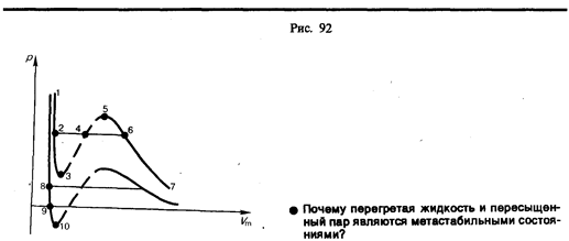 Если через крайние точки горизонтальных участков семейства изотерм провести линию, то получится колоколообразная кривая (рис. 91), ограничивающая область двухфазных состояний вещества. Эта кривая и критическая изотерма делят диаграмму р,V m под изотермой на три области: под колоколообразной кривой располагается область двухфазных состояний (жидкость и насыщенный пар), слева от нее находится область жидкого состояния, а справа — область пара. Пар отличается от остальных газообразных состояний тем, что при изотермическом сжатии претерпевает процесс сжижения. Газ же при температуре выше критической не может быть превращен в жидкость ни при каком давлении. Сравнивая изотерму Ван-дер-Ваальса с изотермой Эндрюса (верхняя кривая на рис. 92), видим, что последняя имеет прямолинейный участок 2 — 6, соответствующий двухфазным состояниям вещества. Правда, при некоторых условиях могут быть реализованы состояния, изображаемые участками ван-дер-ваальсовой изотермы 5— 6 и 2 — 3. Эти неустойчивые состояния называются метастабильными. Участок 2—3 изображает перегретую жидкость, 5—6 — пересыщенный пар. Обе фазы ограниченно устойчивы.