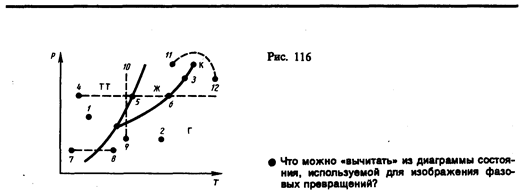 Диаграмма состояния, строящаяся на основе экспериментальных данных, позволяет судить, в каком состоянии находится данное вещество при определенных р и Т, а также какие фазовые переходы будут происходить при том или ином процессе. Например, при условиях, соответствующих точке 1 (рис. 116), вещество находится в твердом состоянии, точке 2 — в газообразном, а точке 3 — одновременно в жидком и газообразном состояниях. Допустим, что вещество в твердом состоянии, соответствующем точке 4, подвергается изобарному нагреванию, изображенному на диаграмме состояния горизонтальной штриховой прямой 4—5—6. Из рисунка видно, что при температуре, соответствующей точке 5, вещество плавится, при более высокой температуре, соответствующей точке 6, — начинает превращаться в газ. Если же вещество находится в твердом состоянии, соответствующем точке 7, то при изобарном нагревании (штриховая прямая 7—8) кристалл превращается в газ минуя жидкую фазу. Если вещество находится в состоянии, соответствующем точке 9, то при изотермическом сжатии (штриховая прямая 9—10) оно пройдет следующие три состояния: газ — жидкость — кристаллическое состояние. На диаграмме состояний (см. рис. 115 и 116) видно, что кривая испарения заканчивается в критической точке К. Поэтому возможен непрерывный переход вещества из жидкого состояния в газообразное и обратно в обход критической точки, без пересечения кривой испарения (переход 11—12 на рис. 116), т. е. такой переход, который не сопровождается фазовыми превращениями. Это возможно благодаря тому, что различие между газом и жидкостью является чисто количественным (оба эти состояния, например, являются изотропными). Переход же кристаллического состояния (характеризуется анизотропией) в жидкое или газообразное может быть только скачкообразным (в результате фазового перехода), поэтому кривые плавления и сублимации не могут обрываться, как это имеет место для кривой испарения в критической точке. Кривая плавления уходит в бесконечность, а кривая сублимации идет в точку, где p =0 и T =0 К.