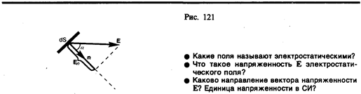 Из формулы (79.1) следует, что единица напряженности электростатического поля — ньютон на кулон (Н/Кл): 1 Н/Кл — напряженность такого поля, которое на точечный заряд 1 Кл действует с силой в 1 Н; 1 Н/Кл= 1 В/м, где В (вольт) — единица потенциала электростатического поля (см. § 84). Графически электростатическое поле изображают с помощью линий напряженности — линий, касательные к которым в каждой точке совпадают с направлением вектора Е (рис. 119). Линиям напряженности приписывается направление, совпадающее с направлением вектора напряженности. Так как в каждой данной точке пространства вектор напряженности имеет лишь одно направление, то линии напряженности никогда не пересекаются. Для однородного поля (когда вектор напряженности в любой точке постоянен по величине и направлению) линии напряженности параллельны вектору напряженности. Если поле создается точечным зарядом, то линии напряженности — радиальные прямые, выходящие из заряда, если он положителен (рис. 120, а), и входящие в него, если заряд отрицателен (рис. 120, б). Вследствие большой наглядности графический способ представления электростатического поля широко применяется в электротехнике. Чтобы с помощью линий напряженности можно было характеризовать не только направление, но и значение напряженности электростатического поля, условились проводить их с определенной густотой (см. рис. 119): число линий напряженности, пронизывающих единицу площади поверхности, перпендикулярную линиям напряженности, должно быть равно модулю вектора Е. Тогда число линий напряженности, пронизывающих элементарную площадку d S, нормаль n которой образует угол a с вектором Е, равно Е d S cos a = En d S, где Еп —проекция вектора Е на нормаль n к площадке d S (рис. 121). Величина