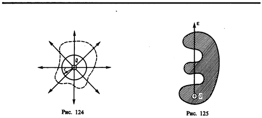 Этот результат справедлив для замкнутой поверхности любой формы. Действительно, если окружить сферу (рис. 124) произвольной замкнутой поверхностью, то каждая линия напряженности, пронизывающая сферу, пройдет и сквозь эту поверхность. Если замкнутая поверхность произвольной формы охватывает заряд (рис. 125), то при пересечении любой выбранной линии напряженности с поверхностью она то входит в нее, то выходит из нее. Нечетное число пересечений при вычислении потока в конечном счете сводится к одному пересечению, таккак поток считается положительным, если линии напряженности выходят из поверхности, и отрицательным для линий, входящих в поверхность. Если замкнутая поверхность не охватывает заряда, то поток сквозь нее равен нулю, так как число линий напряженности, входящих в поверхность, равно числу линий напряженности, выходящих из нее.