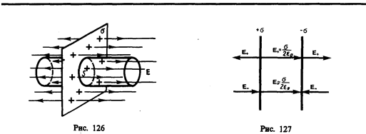 § 82. Применение теоремы Гаусса к расчету некоторых электростатических полей в вакууме 1. Поле равномерно заряженной бесконечной плоскости. Бесконечная плоскость (рис. 126) заряжена с постоянной поверхностной плотностью +s (s = d Q/ d S — заряд, приходящийся на единицу поверхности). Линии напряженности перпендикулярны рассматриваемой плоскости и направлены от нее в обе стороны. В качестве замкнутой поверхности мысленно построим цилиндр, основания которого параллельны заряженной плоскости, а ось перпендикулярна ей. Так как образующие цилиндра параллельны линиям напряженности (соsa=0), то поток вектора напряженности сквозь боковую поверхность цилиндра равен нулю, а полный поток сквозь цилиндр равенсумме потоков сквозь его основания (площади оснований равны и для основания Еn совпадает с Е), т. е. равен 2 ES. Заряд, заключенный внутри построенной цилиндрической поверхности, равен s S. Согласно теореме Гаусса (81.2), 2 ES= s S/ e0, откуда