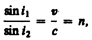 Для вывода закона преломления предположим, что плоская волна (фронт волны — плоскость AВ), распространяющаяся в вакууме вдоль направления I со скоростью света с, падает на границу раздела со средой, в которой скорость ее распространения равна v (рис. 244). Пусть время прохождения волной пути ВС равно D t. Тогда BC=c D t. За это же время фронт волны, возбуждаемый точкой A в среде со скоростью v, достигнет точек полусферы, радиус которой AD=v D t. Положение фронта преломленной волны в этот момент времени в соответствии с принципом Гюйгенса задается плоскостью DC, а направление ее распространения — лучом III. Из рис. 244 следует, что AC=BC/ sin i 1 =AD/ sin i 2, т. е. c D t/ sin i 1 =v D t/ sin i 2 c, откуда