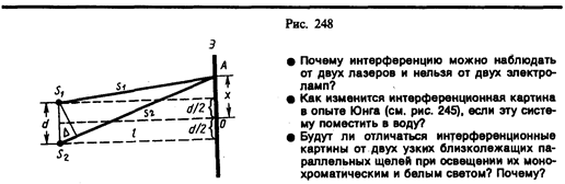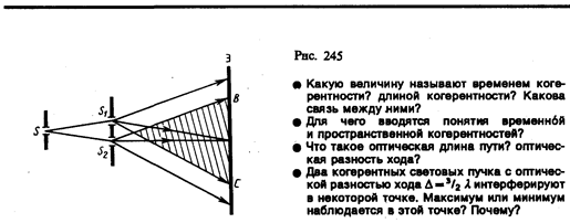 то d = ±2(т +1)p, и колебания, возбуждаемые в точке М обеими волнами, будут происходить в противофазе. Следовательно, (172.3) является условием интерференционного минимума. § 173. Методы наблюдения интерференции света Для осуществления интерференции света необходимо получить когерентные световые пучки, для чего применяются различные приемы. До появления лазеров (см. § 233) во всех приборах для наблюдения интерференции света когерентные пучки получали разделением и последующим сведением световых лучей, исходящих из одного и того же источника. Практически это можно осуществить с помощью экранов и щелей, зеркал и преломляющих тел. Рассмотрим некоторые из этих методов. 1. Метод Юнга. Источником света служит ярко освещенная щель S (рис. 245), от которой световая волна падает на две узкие равноудаленные щели S 1 и S 2, параллельные щели S. Таким образом, щели S 1 и S 2 играют роль когерентных источников.