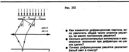 т. е. между двумя главными максимумами располагается один дополнительный минимум. Аналогично можно показать, что между каждыми двумя главными максимумами при трех щелях располагается два дополнительных минимума, при четырех щелях — три и т. д. Если дифракционная решетка состоит из N щелей, то условием главных минимумов является условие (180.2), условием главных максимумов — условие (180.3), а условием дополнительных минимумов