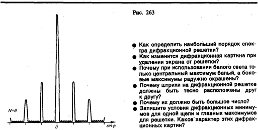 где т' может принимать все целочисленные значения, кроме 0, N, 2 N,.... т. е. кроме тех, при которых условие (180.4) переходит в (180.3). Следовательно, в случае N щелей между двумя главными максимумами располагается N– 1 дополнительных минимумов, разделенных вторичными максимумами, создающими весьма слабый фон. Чем больше щелей N, тем большее количество световой энергии пройдет через решетку, тем больше минимумов образуется между соседними главными максимумами, тем, следовательно, более интенсивными и более острыми будут максимумы. На рис. 263 качественно представлена дифракционная картина от восьми щелей. Так как модуль sin j не может быть больше единицы, то из (180.3) следует, что число главных максимумов
