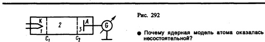 равной разности энергий соответствующих стационарных состояний (Еn и Em — соответственно энергии стационарных состояний атома до и после излучения (поглощения)). При Еm<Еn происходит излучение фотона (переход атома из состояния с большей энергией в состояние с меньшей энергией, т. е. переход электрона с более удаленной от ядра орбиты на более близлежащую), при Еm>Еn — его поглощение (переход атома в состояние с большей энергией, т. е. переход электрона на более удаленную от ядра орбиту). Набор возможных дискретных частот n = (En—Em)/h квантовых переходов и определяет линейчатый спектр атома. § 211. Опыты Франка и Герца Изучая методом задерживающего потенциала столкновения электронов с атомами газов (1913), Д. Франк и Г. Герц экспериментально доказали дискретность значений энергии атомов. Принципиальная схема их установки приведена на рис. 292. Вакуумная трубка, заполненная парами ртути (давление приблизительно равно 13 Па), содержала катод (К), две сетки (C1 и С2) и анод (А). Электроны, эмиттируемые катодом, ускорялись разностью потенциалов, приложенной между катодом и сеткой C1. Между сеткой С2 и анодом приложен небольшой (примерно 0,5 В) задерживающий потенциал.
