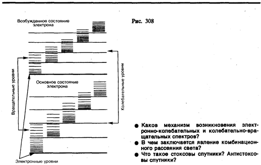 Как будет показано в § 231, структура энергетических уровней молекул определяет их спектр излучения, возникающий при квантовых переходах между соответствующими энергетическими уровнями. § 231. Молекулярные спектры. Комбинационное рассеяние света Строение молекул и свойства их энергетических уровней проявляются в молекулярных спектрах — спектрах излучения (поглощения), возникающих при квантовых переходах между уровнями энергии молекул. Спектр излучения молекулы определяется структурой ее энергетических уровней и соответствующими правилами отбора (так, например, изменение квантовых чисел, соответствующих как колебательному, так и вращательному движению, должно быть равно ± 1). Итак, при разных типах переходов между уровнями возникают различные типы молекулярных спектров. Частоты спектральных линий, испускаемых молекулами, могут соответствовать переходам с одного электронного уровня на другой (электронные спектры) или с одного колебательного (вращательного) уровня на другой (колебательные (вращательные) спектры). Кроме того, возможны и переходы с одними значениями D E кол и D E вращ на уровни, имеющие другие значения всех трех компонентов, в результате чего возникают электронно-колебательные и колебательно-вращательные спектры. Поэтому спектр молекул довольно сложный. Типичные молекулярные спектры — полосатые, представляющие собой совокупность более или менее узких полос в ультрафиолетовой, видимой и инфракрасной областях. Применяя спектральные приборы высокой разрешающей способности, можно видеть, что полосы представляют собой настолько тесно расположенные линии, что они с трудом разрешаются. Структура молекулярных спектров различна для разных молекул и с увеличением числа атомов в молекуле усложняется (наблюдаются лишь сплошные широкие полосы). Колебательными и вращательными спектрами обладают только многоатомные молекулы, а двухатомные их не имеют. Это объясняется тем, что двухатомные молекулы не имеют дипольных моментов (при колебательных и вращательных переходах отсутствует изменение дипольного момента, что является необходимым условием отличия от нуля вероятности перехода). В 1928 г. академики Г. С. Ландсберг (1890—1957) и Л. И. Мандельштам и одновременно индийские физики Ч. Раман (1888—1970) и К. Кришнан (р. 1911) открыли явление комбинационного рассеяния света. Если на вещество (газ, жидкость, прозрачный кристалл) падает строго монохроматический свет, то в спектре рассеянного света помимо несмещенной спектральной линии обнаруживаются новые линии, частоты которых представляют собой суммы или разности частоты n падающего света и частот ni собственных колебаний (или вращений) молекул рассеивающей среды. Линии в спектре комбинационного рассеяния с частотами n – ni, меньшими частоты n падающего света, называются стоксовыми (или красными) спутниками, линии с частотами n + ni, большими n, — антистоксовыми (или фиолетовыми) спутниками. Анализ спектров комбинационного рассеяния приводит к следующим выводам: 1) линии спутников располагаются симметрично по обе стороны от несмещенной линии; 2) частоты ni не зависят от частоты падающего на вещество света, а определяются только рассеивающим веществом, т. е. характеризуют его состав и структуру; 3) число спутников определяется рассеивающим веществом; 4) интенсивность антистоксовых