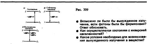 В статистической физике известен принцип детального равновесия, согласно которому при термодинамическом равновесии каждому процессу можно сопоставить обратный процесс, причем скорости их протекания одинаковы. А. Эйнштейн применил этот принцип и закон сохранения энергии при рассмотрении излучения и поглощения электромагнитных волн в случае черного тела. Из условия, что при равновесии полная вероятность испускания (спонтанного и вынужденного) фотонов равна вероятности поглощения фотонов той же частоты, Эйнштейн получил выведенную ранее Планком формулу (200.3). Эйнштейн и Дирак показали, что вынужденное излучение (вторичные фотоны) тождественно вынуждающему излучению (первичным фотонам): оно имеет такие же частоту, фазу, поляризацию и направление распространения, как и вынуждающее излучение. Следовательно, вынужденное излучение строго когерентно с вынуждающим излучением, т. е. испущенный фотон неотличим от фотона, падающего на атом. Испущенные фотоны, двигаясь в одном направлении и встречая другие возбужденные атомы, стимулируют дальнейшие индуцированные переходы, и число фотонов растет лавинообразно. Однако наряду с вынужденным излучением возможен и конкурирующий процесс — поглощение. Поэтому для усиления падающего излучения необходимо, чтобы число актов вынужденного излучения фотонов (оно пропорционально заселенности возбужденных состояний) превышало число актов поглощения фотонов (оно пропорционально заселенности основных состояний). В системе атомов, находящейся в термодинамическом равновесии, поглощение падающего излучения будет преобладать над вынужденным, т. е. падающее излучение при прохождении через вещество будет ослабляться. Чтобы среда усиливала падающее на нее излучение, необходимо создать неравновесное состояние системы, при котором число атомов в возбужденных состояниях было бы больше, чем их число в основном состоянии. Такие состояния называются состояниями с инверсией населенностей. Процесс создания неравновесного состояния вещества (перевод системы в состояние с инверсией населенностей) называется накачкой. Накачку можно осуществить оптическими, электрическими и другими способами. В средах с инверсными состоящими вынужденное излучение может превысить поглощение, вследствие чего падающий пучок света при прохождении через эти среды будет усиливаться (эти среды называются активными). В данном случае явление протекает так, как если бы в законе Бугера I=I 0 e–ax (см. (187.1)) коэффициент поглощения a, зависящий, в свою очередь, от интенсивности излучения, стал отрицательным. Активные среды поэтому можно рассматривать в качестве сред с отрицательным коэффициентом поглощения. Впервые на возможность получения сред, в которых свет может усиливаться за счет вынужденного излучения, указал в 1939 г. российский физик В. А. Фабрикант, экспериментально обнаружив вынужденное излучение паров ртути, возбужденных при электрическом разряде. Открытие явления усиления электромагнитных волн и изобретенный способ их усиления (В. А. Фабрикант, М. М. Вудынский, ф. А. Бугаева; 1951) легли в основу квантовой электроники, положения которой позволили впоследствии осуществить квантовые усилители и квантовые генераторы света. § 233. Оптические квантовые генераторы (лазеры) Практически инверсное состояние среды осуществ