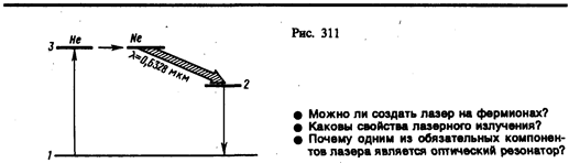Каждый фотон, случайно родившийся при спонтанных переходах, в принципе может инициировать (порождать) в активной среде множество вынужденных переходов 2 ® 1, в результате чего появляется лавина вторичных фотонов, являющихся копиями первичных. Таким образом и зарождается лазерная генерация. Однако спонтанные переходы носят случайный характер, и спонтанно рождающиеся фотоны испускаются в разных направлениях. Тем самым в самых разных направлениях распространяются и лавины вторичных фотонов. Следовательно, излучение, состоящее из подобных лавин, не может обладать высокими когерентными свойствами. Для выделения направления лазерной генерации используется принципиально важный элемент лазера — оптический резонатор. В простейшем случае им служит пара обращенных друг к другу параллельных (или вогнутых) зеркал на общей оптической оси, между которыми помещается активная среда (кристалл или кювета с газом). Как правило, зеркала изготовляются так, что от одного из них излучение полностью отражается, а второе — полупрозрачно. Фотоны, движущиеся под углами к оси кристалла или кюветы, выходят из активной среды через ее боковую поверхность. Те же из фотонов, которые движутся вдоль оси, многократно отразятся от противоположных торцов, каждый раз вызывая вынужденное испускание вторичных фотонов, которые, в свою очередь, вызовут вынужденное излучение, и т. д. Так как фотоны, возникшие при вынужденном излучении, движутся в том же направлении, что и первичные, то поток фотонов, параллельный оси кристалла или кюветы, будет лавинообразно нарастать. Многократно усиленный поток фотонов выходит через полупрозрачное зеркало, создавая строго направленный световой пучок огромной яркости. Таким образом, оптический резонатор «выясняет» направление (вдоль оси) усаливаемого фотонного потока, формируя тем самым лазерное излучение с высокими когерентными свойствами. Первым газовым лазером непрерывного действия (1961) был лазер на смеси атомов неона и гелия. Газы обладают узкими линиями поглощения, лампы же излучают свет в широком интервале длин волн; следовательно, применять их в качестве накачки невыгодно, так какиспользуется только часть мощности лампы. Поэтому в газовых лазерах инверсная населенность уровней осуществляется электрическим разрядом, возбуждаемым в газах. В гелий-неоновом лазере накачка происходит в два этапа: гелий служит носителем энергии возбуждения, а неон дает лазерное излучение. Электроны, образующиеся в разряде, при столкновениях возбуждают атомы гелия, которые переходят в возбужденное состояние 3 (рис. 311). При столкновениях возбужденных атомов гелия с атомами неона происходит их возбуждение и они переходят на один из верхних уровней неона, который расположен вблизи соответствующего уровня гелия. Переход атома неона с верхнего уровня 3 на один из нижних уровней 2 приводит к лазерному излучению с l=0,6328 мкм.