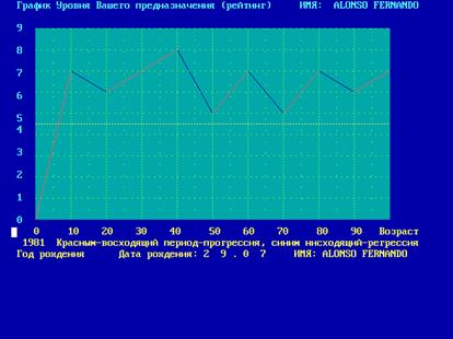 Пример расчета: Дата рождения: Ф.Алонсо 29.07.1981 Перемножаем дату с месяцем на год рождения 2907 х 1981 = 5758767. Переворачиваем полученное число, т.е. переписываем его с конца к началу, получаем: 7678575. Получили семизначный код по десятилетиям, он означает, что уровень предназначения (рейтинг) в 10 лет - 7, в 20 лет – 6, в 30 лет – 7, в 40 лет – 8, в 50 лет – 5, в 60 лет – 7, в 70 лет – 5, а далее все повторяется по циклу, т.е. в 80 лет как в 10 т.е. – 7, и т.д. А в момент рождения (0 лет) уровень равен также нулю. Теперь мы можем построить график жизни Ф.Алонсо, вот он: (он построен программой PIF82 по этому алгоритму). Внизу годы жизни человека, от его рождения, соответственно на нем можно найти любой год (сезон выступления) который нас заинтересует. Сразу можно сказать, что он достаточно высок.