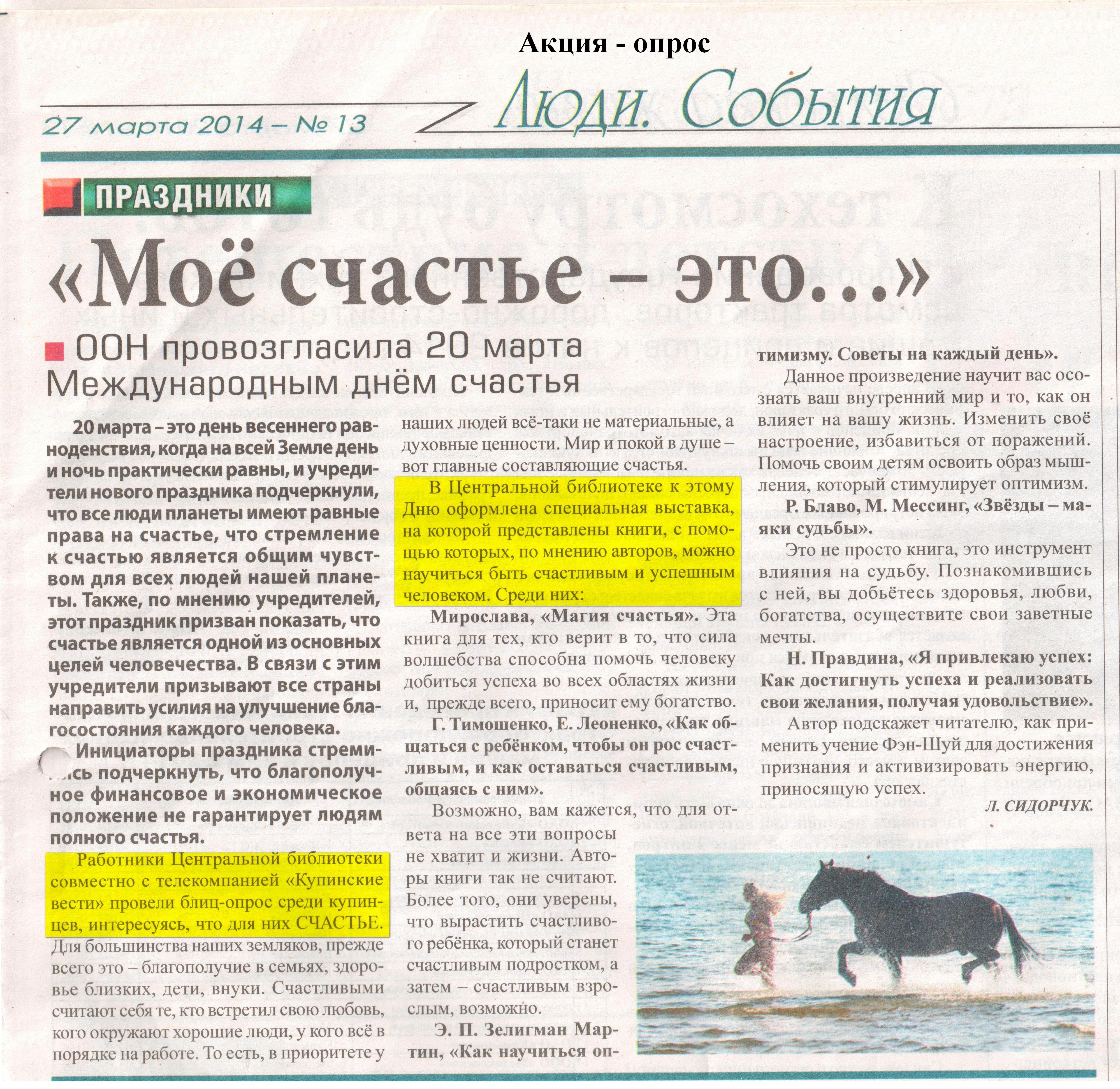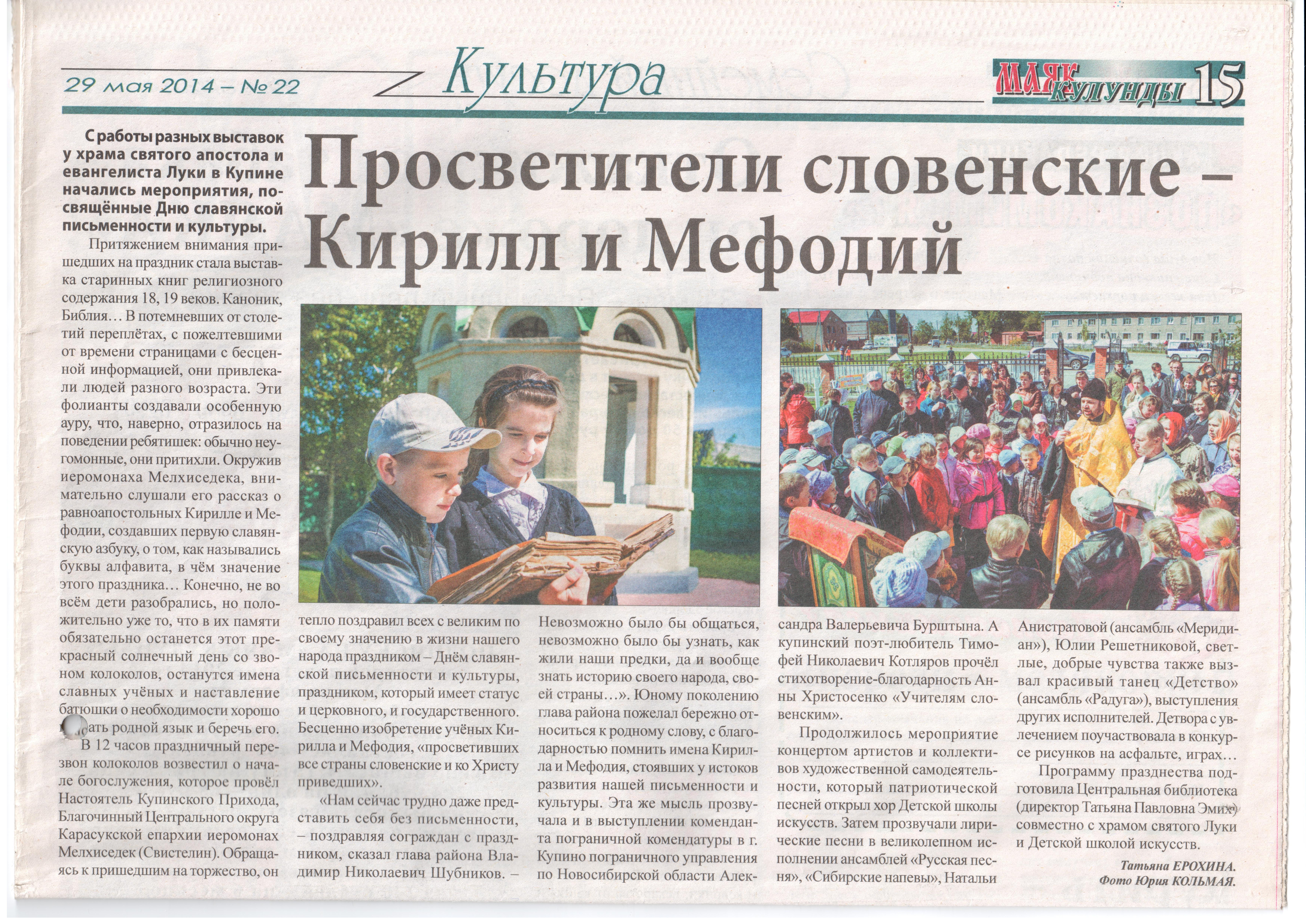 Год 2014 объявлен в России годом культуры. В Купинском районе в текущем году администрациями района и муниципальными образованиями поселений уделялось особое внимание пропаганде всего, что представляет отечественную культуру, оказано содействие творческой активности населения, организации мероприятий в различных видах искусств. Не исключением стала и Центральная библиотека Купинского района, разработавшая обширную и очень интересную программу, включающую в себя проведение литературно-музыкальных композиций, праздников, вечеров встреч, программ, мероприятий, таких как: зональное мероприятие «День электронных информационных ресурсов» (мультимедийные проекты и презентации Краснозерского, Чистоозерного, Кочковского районов); торжественное открытие детской игровой комнаты для проведения досуга юных читателей; курсы повышения квалификации (НГОНБ И ГПНТБ СОРАН). Так совпало, что 2014 год стал юбилейным для Купинского района (90 - летие со дня образования). В преддверии юбилея отдел обслуживания пользователей детей Центральной библиотеки провел конкурс «Купинский район глазами детей». Творческие работы были выполнены в трех номинациях: «Я вырос здесь и край мне этот дорог», «Мой район в объективе», «С районом связанные судьбы». Работы победителей конкурса вошли в краеведческий альбом «Купинский район глазами детей», размещены на сайте МБУ «Центральная библиотека». Одним из знаменательных событий в культурной и общественной жизни области и района было открытие фестиваля I Дедовские чтения в с. Новоключи Купинского района, включившие в себя целый комплекс мероприятий: выставку народных промыслов, спектр информационных услуг для жителей с. Новоключи (КИБО), литературно-музыкальную композицию, круглый стол, «Дедовский костер», призванных увековечить память сибирского писателя. 26 сентября при финансовой поддержке Правительства Новосибирской области, Новосибирского Библиотечного Общества, Центра правовой информации НГОНБ и Новосибирской специальной областной библиотеки для незрячих и слабовидящих, в рамках празднования юбилея района в Центральной библиотеке открылся Публичный центр правовой информации с адаптивной сетью(ПЦПИ), для людей с ограничениями жизнедеятельности. Анализируя деятельность Центральной библиотеки в Год культуры можно сделать вывод, что задачи, поставленные перед библиотекой, в уходящем году выполнились. В наступающем, 2015 году, Центральная библиотека не собирается снижать темпы своего развития и планирует активно принимать участие в культурной и общественной жизни района и области.