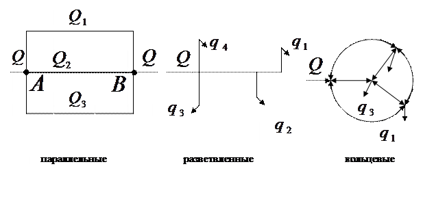 Сложным называют трубопровод, состоящий из основной магистрали и ряда отходящих от нее ответвлений (рис. 42). Сложные трубопроводы подразделяются на следующие виды: -параллельные, когда к основной магистрали параллельно подключена одна или несколько труб; -разветвленные или тупиковые, когда жидкость из магистрали подается в боковые ответвления, обратно в магистраль она не возвращается; -кольцевые, представляющие собой замкнутую сеть (кольцо), питаемую от магистрали.