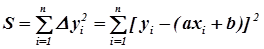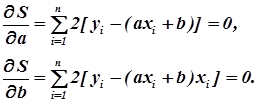 имела минимум. Здесь xi и yi - значения величин х и у в i -том измерении, n - количество измерений. Величина S будет минимальной, если её частные производные по параметрам а и b будут равны нулю: