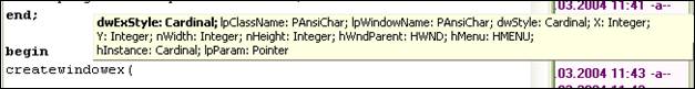 И, наконец, вызов функции с конкретными параметрами окна: hwnd:=CreateWindowEx( 0, { параметр, относящийся к стилю окна} Timer, {имя класса окна, то, что было определено в lpszClassName}