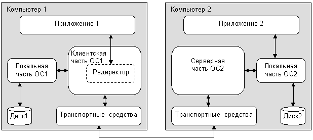 Рис. 1.2. Основные функциональные компоненты сетевой ОС Средства управления локальными ресурсами реализуют все функции ОС автономного компьютера, описанные выше. Сетевые средства подразделяются на три компонента: - серверная часть ОС – средства предоставления локальных ресурсов и услуг в общее пользование; - клиентская часть ОС – средства запроса доступа к удаленным (т. е. принадлежащим другим компьютерам сети) ресурсам и услугам; - транспортные, или коммуникационные средства ОС – средства, совместно с коммуникационной системой обеспечивающие обмен сообщениями в сети. Правила взаимодействия компьютеров при передаче сообщений по сети фиксируются в коммуникационных протоколах (Ethernet, Token Ring, IP, IPX и пр.). Упрощенная схема работы сетевых ОС иллюстрируется на рис. 1.3.на примере взаимодействия двух компьютеров. Суть взаимодействия: пусть приложение, работающее на первом компьютере, использует файлы, размещенные на диске второго компьютера.