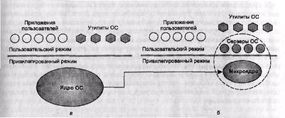 Микроядерная архитектура является альтернативой классическому способу построения операционной системы. Под классической архитектурой в данном случае понимается структурная организация ОС, в соответствии с которой все основные функции операционной системы, составляющие многослойное ядро, выполняются в привилегированном режиме. При этом некоторые вспомогательные функции ОС оформляются в виде приложений и выполняются в пользовательском режиме наряду с обычными пользовательскими программами (становясь системными утилитами или обрабатывающими программами). Каждое приложение пользовательского режима работает в собственном адресном пространстве и защищено тем самым от какого-либо вмешательства других приложений. Код ядра, выполняемый в привилегированном режиме, имеет доступ к областям памяти всех приложений, но сам полностью от них защищен, Приложения обращаются к ядру с запросами на выполнение системных функций. Суть микроядерной архитектуры состоит в следующем. В привилегированном режиме остается работать только очень небольшая часть ОС, называемая микроядром (рис. 10). Микроядро защищено от остальных частей ОС и приложений. В состав микроядра обычно входят машинно-зависимые модули, а также модули, выполняющие базовые (но не все!)функции ядра по управлению процессами, обработке прерываний, управлению виртуальной памятью, пересылке сообщений и управлению устройствами ввода-вывода, связанные с загрузкой или чтением регистров устройств. Набор функций микроядра обычно соответствует функциям слоя базовых механизмов обычного ядра. Такие функции операционной системы трудно, если не невозможно, выполнить в пространстве пользователя.