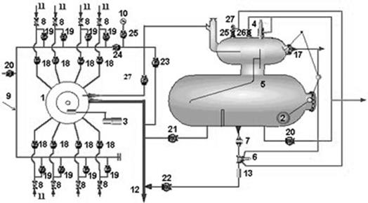 Продукция скважин по сборным коллекторам (11), через обратные клапана (11) и линии задвижек (18) поступает в переключатель (1) ПСМ (переключатель скважин многоходовой). При помощи переключателя ПСМ продукция одной из скважин направляется через задвижку (28) в сепаратор (5), а продукция остальных скважин направляется в общий трубопровод (12) через задвижку (23). В сепараторе происходит отделение газа от жидкости. Выделившийся газ при открытой заслонке (17), поступает в общий трубопровод, а жидкость накапливается в нижней емкости сепаратора. С помощью регулятора расхода (6) и заслонки (17), соединенной с поплавковым уровнемером (2), обеспечивается циклическое прохождение накопившейся жидкости через турбинный счетчик жидкости ТОР с постоянными скоростями, что обеспечивает измерение дебита скважин в широком диапазоне с малыми погрешностями. Регулятор расхода РР соединен двумя импульсными трубками с сосудом и линией после заслонки (17). При перепаде давления РР обеспечивает выход жидкости из сосуда (5) через счетчик ТОР в общий трубопровод. Из общего трубопровода жидкость движется на ДНС или УПСВ. Для предотвращения превышения давления в сосуде (5) на нем установлен предохранительный клапан СППК (4). СППК срабатывает при давлении в сосуде выше допустимого и жидкость из сосуда (5) поступает в дренажную линию. Date: 2015-08-15; view: 674; Нарушение авторских прав |