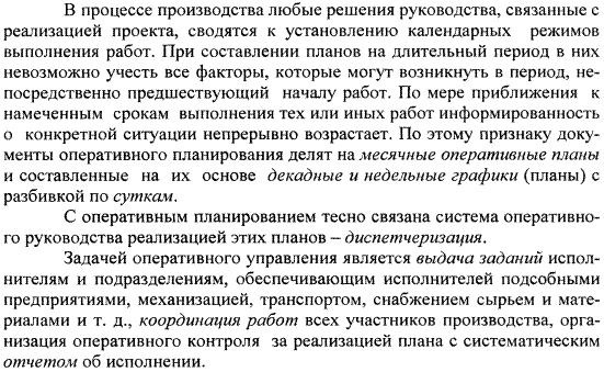5.5.3 Оперативный месячный план строительно-монтажной организации включает показатели, планируемые по участкам старших прорабов, отдельно по заказчикам, участкам, объектам и этапам работ. Объемы работ субподрядчиков показываются отдельно по каждой организации. Единицей измерения в планах являются укрупненные объемы работ. 5.5.4 Разработка оперативных планов производится производственно-техническими отделами управлений с обязательным участием прорабов и руководителей подсобных производств и хозяйств. В рабочем порядке согласовываются контрольные цифры объемов работ по генподряду и собственными силами с начальниками участков и субподрядными организациями. 5.5.5 Основными документами оперативного планирования строительного производства являются недельно-суточные графики производства строительно-монтажных работ; недельно-суточные графики-заявки обеспечения материалами, конструкциями, механизмами, автотранспортом; сводные недельно-суточные графики-знаки; сводные ведомости поставок местных строительных материалов; сводные недельно-суточные графики обеспечения механизмами, автомобилями; недельно-суточные графики работы строительных механизмов; недельно-суточные графики транспортных грузоперевозок. 5.5.6 Недельно-суточные графики производства работ составляются генподрядчиком и служат основанием для графиков субподрядных организаций, поставщиков и других обеспечивающих организаций. 5.5.7 В соответствии с графиками производства работ строятся графики комплектации и поставки материальных ресурсов.
