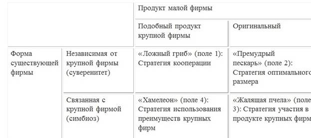 Поле 1. Стратегия копирования («Ложный гриб»). Сущность заключается в том, что малая фирма, используя результаты научно-исследовательских работ более крупных фирм по оригинальным продуктам, выпускает копии этих продуктов по ценам и качеству значительно уступающим, как правило, оригиналу. Поле 2. Стратегия оптимального размера («Премудрый пескарь»). Малая фирма осуществляет свою деятельность под девизом: «не высовываться» за рамки своей рыночной ниши. Эта стратегия хотя и обеспечивает выживаемость малой фирмы, но служит препятствием расширению деятельности фирмы. Поле 3. Стратегия участия в продукте крупной фирмы («Жалящая пчела»). Использование данной стратегии возможно тогда, когда отдельный мелкий элемент продукции более крупной фирмы — это конечный продукт для данной фирмы. Во избежание зависимости от более крупной фирмы малая фирма должна стремиться ограничить долю оборота, приходящегося на одного крупного клиента, т.е. мелкая фирма должна стремиться поставлять нескольким крупным фирмам товары таким образом, чтобы доля для каждой из них в общем объеме продаж фирмы не превышала 20%. Это позволяет малым фирмам, как «жалящим пчелам», заставлять более крупные фирмы «вертеться» и в силу установления низких цен на реализацию продуктов вынуждать крупные фирмы избавляться от непроизводительных подразделений. Поле 4. Стратегия использования преимуществ крупной фирмы («Хамелеон»). Это т.н. стратегия франчайзинга, в соответствии с которой заключается договор между мелкой и крупной фирмой, согласно которому крупная фирма обязуется снабжать мелкую фирму собственными товарами, рекламными услугами, отработанными технологиями бизнеса, представляет краткосрочный кредит на льготных условиях, сдает в аренду свое оборудование. В свою очередь малая фирма обязуется иметь деловые контакты исключительно с данной крупной фирмой, вести бизнес «по правилам» этой крупной фирмы и перечислять определенную договором долю от суммы продаж в пользу крупной фирмы.