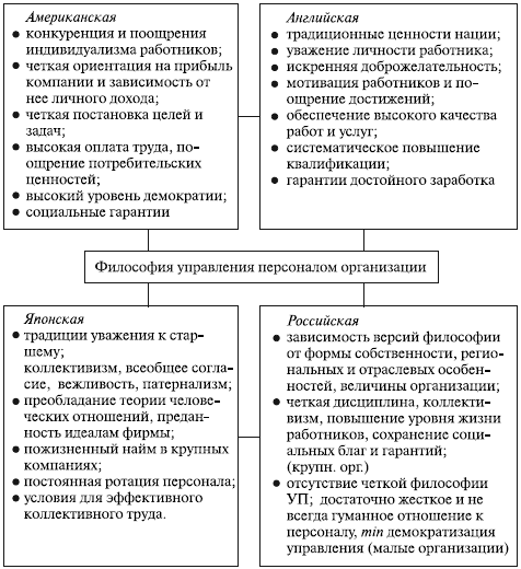 Под философией организации понимается вся совокупность групповых ценностей, принятых способов ведения дел, с которыми ее члены себя отождествляют. Разрабатываемая на основании философии управления персоналом философия организации оформляется как отдельный нормативный документ Базовые документы при разработке философии организации – это Конституция (Основной закон), Гражданский кодекс, Трудовой кодекс, Декларация прав человека, Коллективный договор, религиозные писания (Библия, Коран), Устав предприятия. Разработка философии организации должна учитывать: – национальный состав работников; – тип производства; – вид собственности; – отрасль народного хозяйства; – численность персонала организации; – уровень благосостояния работников; – культурный уровень персонала; – приоритеты руководства организации. Философия управления персоналом – это осмысленное управление людьми в организации с позиций философского понятийного аппарата: происхождения (генезиса), сущности, принципов, целей, связи с другими науками и в соответствии с ними представление процесса управления с логической, психологической, социологической, этической и других точек зрения. Сущность философии управления персоналом состоит в необходимости улучшения качества трудовой жизни, т. е. работники должны иметь возможность удовлетворять свои личные потребности; иметь условия для справедливых, доверительных, равноправных и открытых взаимоотношений; полностью использовать свои навыки; активно участвовать в принятии важных производственных решений; получать адекватные компенсации за трудовые заслуги; быть обеспечены безопасными и здоровыми условиями труда. Такие позиции администрации завоевывают преданность персонала организации. Философия управления персоналом в организации имеет национальные особенности