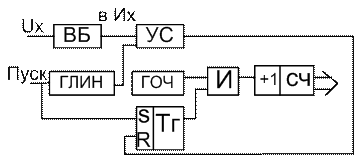 При проектировании используется 2 ключевых метода: 1) Метод последовательного счета; 2) метод считывания (параллельный) 1) требует, чтобы датчик угла поворота или угла перемещения создавал последовательность равномерно отстоящих друг от друга импульсов, которые воспринимаются одним чувствительным элементом. Для формулирования кода пропорционального угловому или линейному перемещению необходимо сформированные чувствительным элементом импульсы (число которых пропорционально измеряемому параметру) подсчитать счетчиком. Помеха, воспринятая счетчиком, будет сохраняться в течении последующего времени и накапливаться при действии других помех, поэтому необходимо решать вопрос о помехозащищенности. Кроме того, счетчик периодически должен устанавливаться в нулевое положение. Формирование сигнала установки в нуль определяется максимальным значением измеряемого угла. 2) должны иметь число чувствительных элементов равное числу разрядов формируемого кода, поэтому здесь разрешающая способность достигается труднее, чем в установленных последов счета. В параллельных преобразованиях нельзя использовать коды типа двоичного, т.е. такие коды, в которых при смене двух соседних значений может возникать погрешность, составляющая 10-ки процентов (при перек-и с кода 011 на двоичный код 100 может возникнуть погрешность достигающая 100%) Чаще всего в таких преобразованиях используется код Грея, который строится таким образом, что два соседних значения кода изменяются только в одном разряде. В обоих типах преобразований в качестве чувствительных элементов могут использоваться фотоэлектрические, индукционные емкостные элементы. Наибольшее применение в настоящее время находят фотоэлектрические чувствительные элементы, которые обеспечивают как высокую точность, так и высокую надежность. Рассмотренные простейшие подходы к реализации преобраз-ли общих типов используются для построения преобразований малой и средней точности (до 10-1%). Для устройств высокой точности используется двухканальные пространственные преобразователи, которые имеют канал формирования грубого и точного кода. Вольтметр цифровой с промежуточным преобразованием во временной интервал (схема, достоинства, недостатки, время преобразования, погрешности, требования к функциональным узлам схемы). 1) При использовании непрерывного ГЛИН