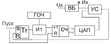 Аналоговый ГЛИН в данной схеме вносит наибольшую нестабильность. В более точных структурах подобного типа целесообразно использовать ступенчато изменяющийся ГЛИН реализованный с использованием счетчика и ЦАП. Для формирования ступенчатой пилы используется стабильный генератор период которого складывается из времени задержки прохождения сигнала через И1 и счетчик 1 времени установления выходного сигнала ЦАП задержки сигнала выхода компаратора (УС) и времени переключения триггера из состояния «1» в состояние «0». Схема варианта б несколько сложнее варианта а, но отличается большей статической точностью за счет высокой стабильности и точности ЦАП, на который формируются ГЛИН. Эта схема достаточно хорошо работает в низкопотенциальных точных преобразованиях и-я в которых отличаются в каждом только наличием локального устройства сравнения и выходного регистра, при этом устройство основного АЦП должно работать с постоянным временем цикла. Т.е. ступенчато изменяющееся пилообразное И-е после сигнала «Пуск» должно изменяться до амплитудного значения. Основные источники статических погрешностей 1-ГЛИН (аналоговый), 2-входной блок, 3-порог чувствительности УС, 4-погрешность дискретности цифрового измерения Тх.